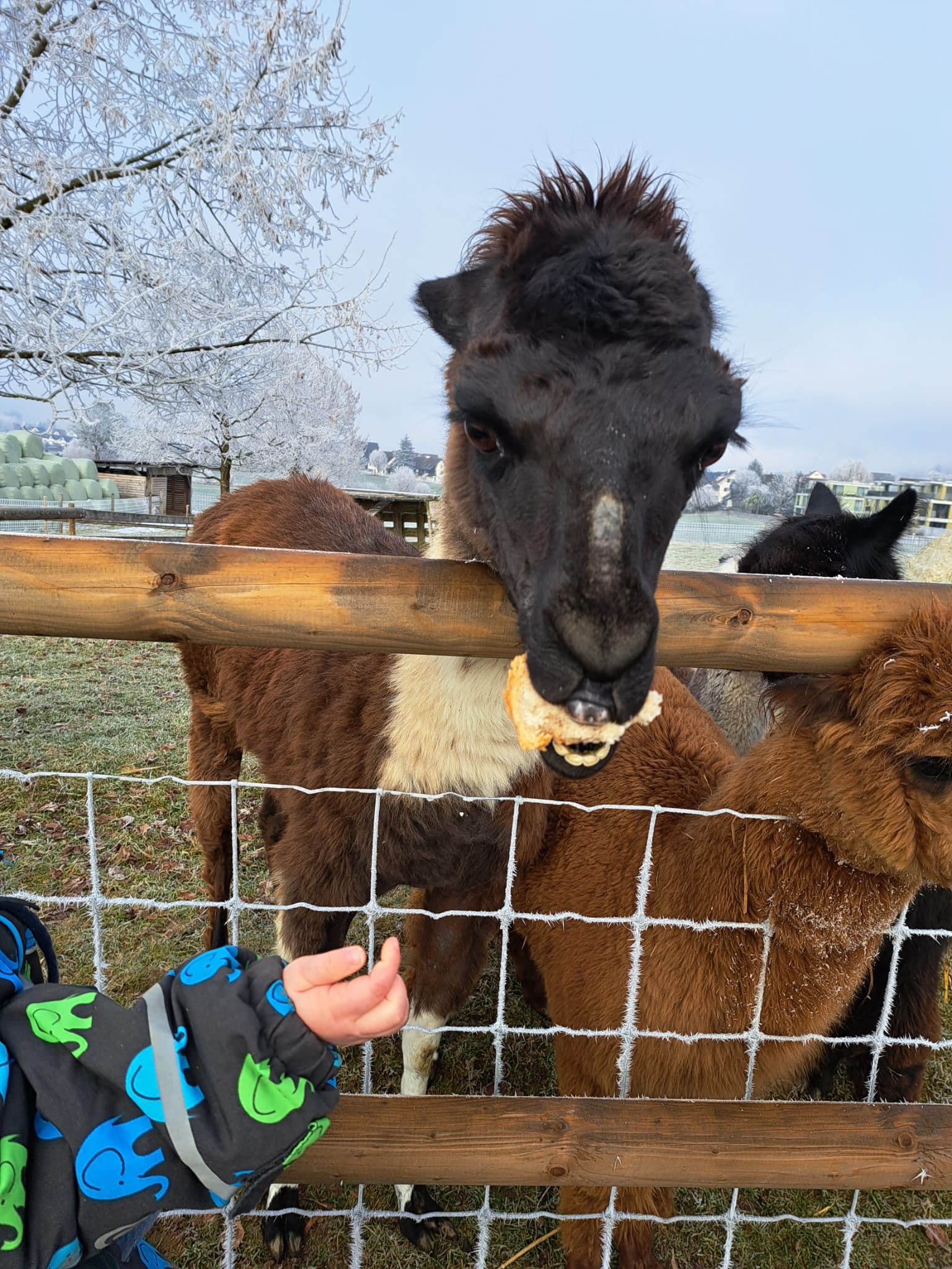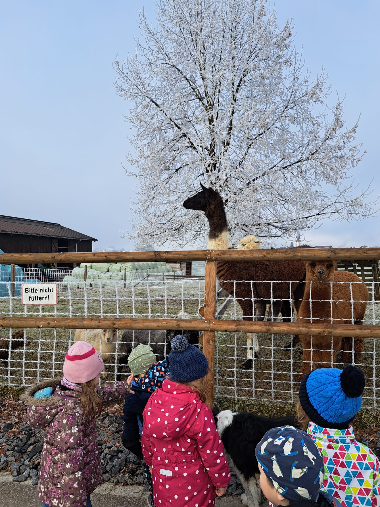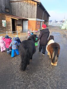 Gut eingepackt spazieren wir zum Bauernhof, um unsere «tierischen Freunde» zu treffen. Wir füttern sie und dürfen sie auch streicheln. Mittlerweile kennen wir uns gegenseitig gut.
