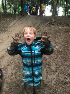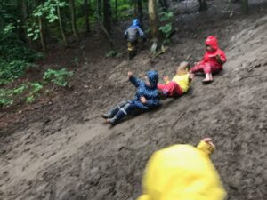 So nass und matschig kann es im Juli sein. Den Kindern ist es „wurst“, es hat richtig Spass gemacht! Denn – wer hätte schon gedacht, dass eine Erdrutsche genau so ein Gaudi ist wie eine Wasserrutsche?